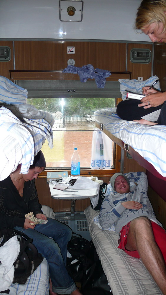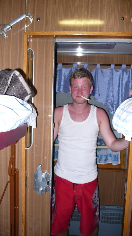 No v bistvu je bil cel vagon ena velika internacionalna druzina, saj smo se prakticno vsi drzali skupaj in pogovarjali med seboj. Dva avstralca, american, francoz in spanka, poljak, nemec, korejc, in dva danca in dva slovenca. Blo je sicer se nekej drugih ljudi, ki so se pa bolj zase drzal. Imel smo pa se eno rusko mamo, v bistvu kondukterko, ki je lepo skrbela za nas. Sam enkrat nam je zaklenila wc…. ko sem jo lepo prosil, da me bo razneslo (glih prej smo dobil eno trgovinco s pivom na postaji) je samo rekla NJET in vzela prazno flasko in jo lepo stisnla v roke. No potem je bilo velik lazje… Bili smo glih v mejnem podrocju in vsake tolk cajta so nas zaklenil v vagon za carinski pregled. No ce bi kaj bolj razumu rusko bi se lahk tud drgac znajdu.