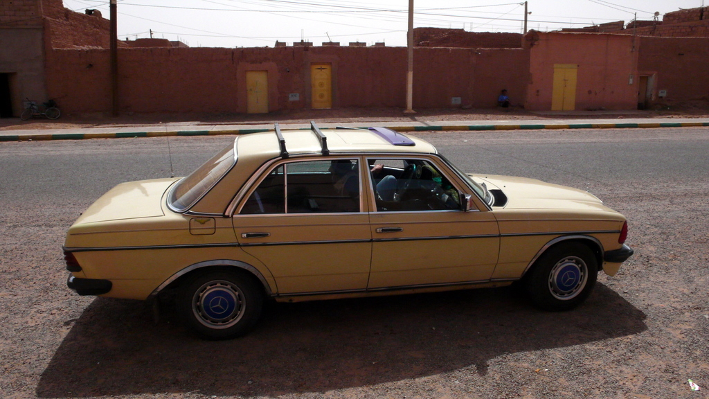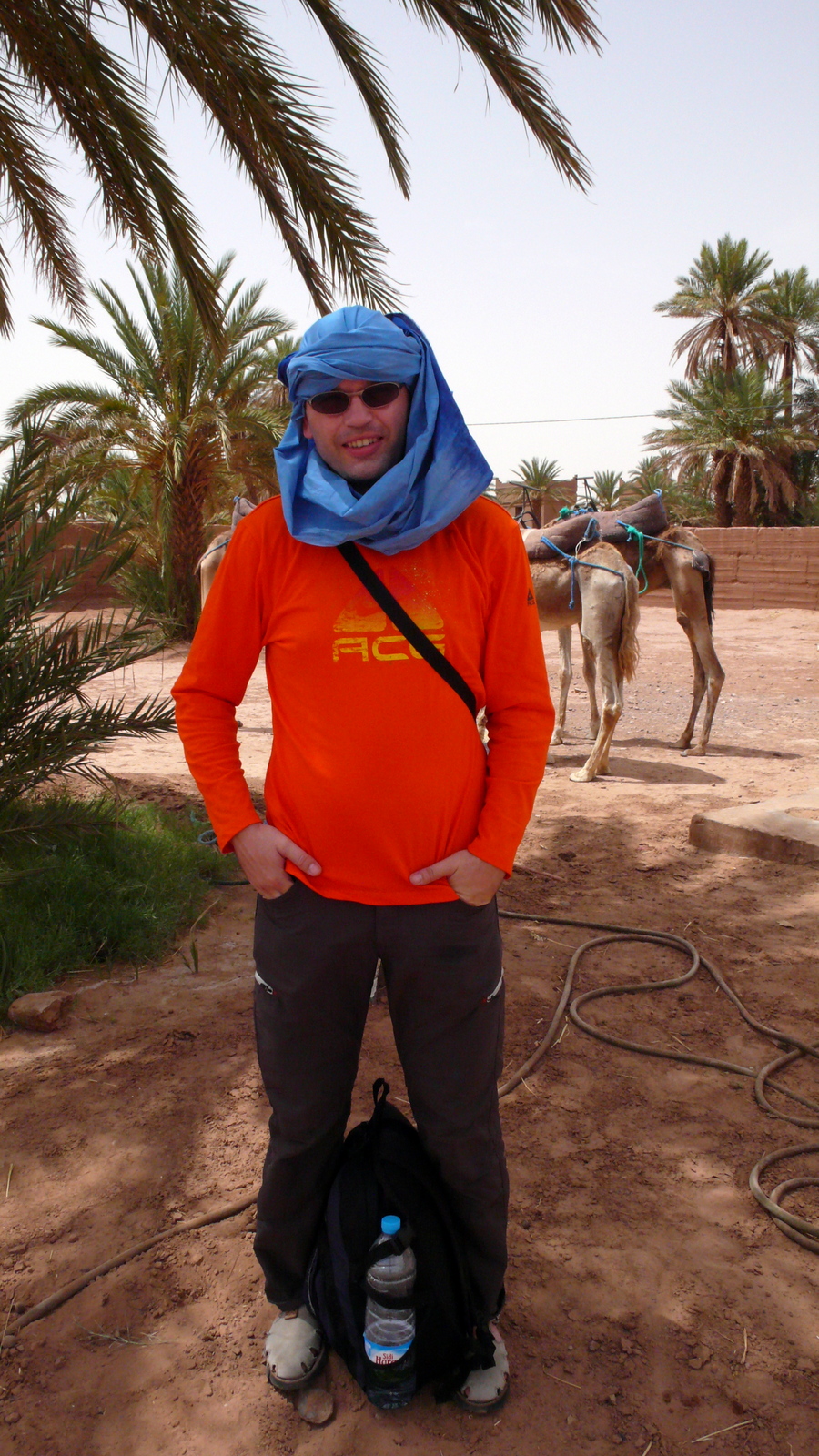 Pot od Zagore do Ouled Driss-a z grand taksijem Mercedes 240D, je trajala skoraj uro in pol, kar je bilo nekako tud dober uvod v vrocino. Voznja pri odprtih oknih in vetru, ki je bolj podoben vrocemu fenu je dalo slutiti kaj nas caka. No kljub vsemu sva se medtem ko so ostali nalagali opremo na nase kamele midva preoblekla v majice z dolgimi rokavi in imela tudi dolge hlace, najin vodic Houssine pa nama je nadel turbane, tak da sva bla v bistvu cist zavita. To je tud edini pogoj da te sonce ne sezge sredi tiste vrocine. Zanimiv je to da sploh ne svicas tolk, saj je vrocina full suha in nebi reku, da je vlaga vec kot 10%.