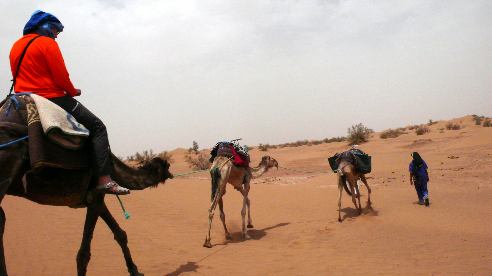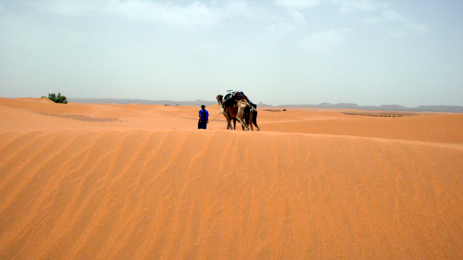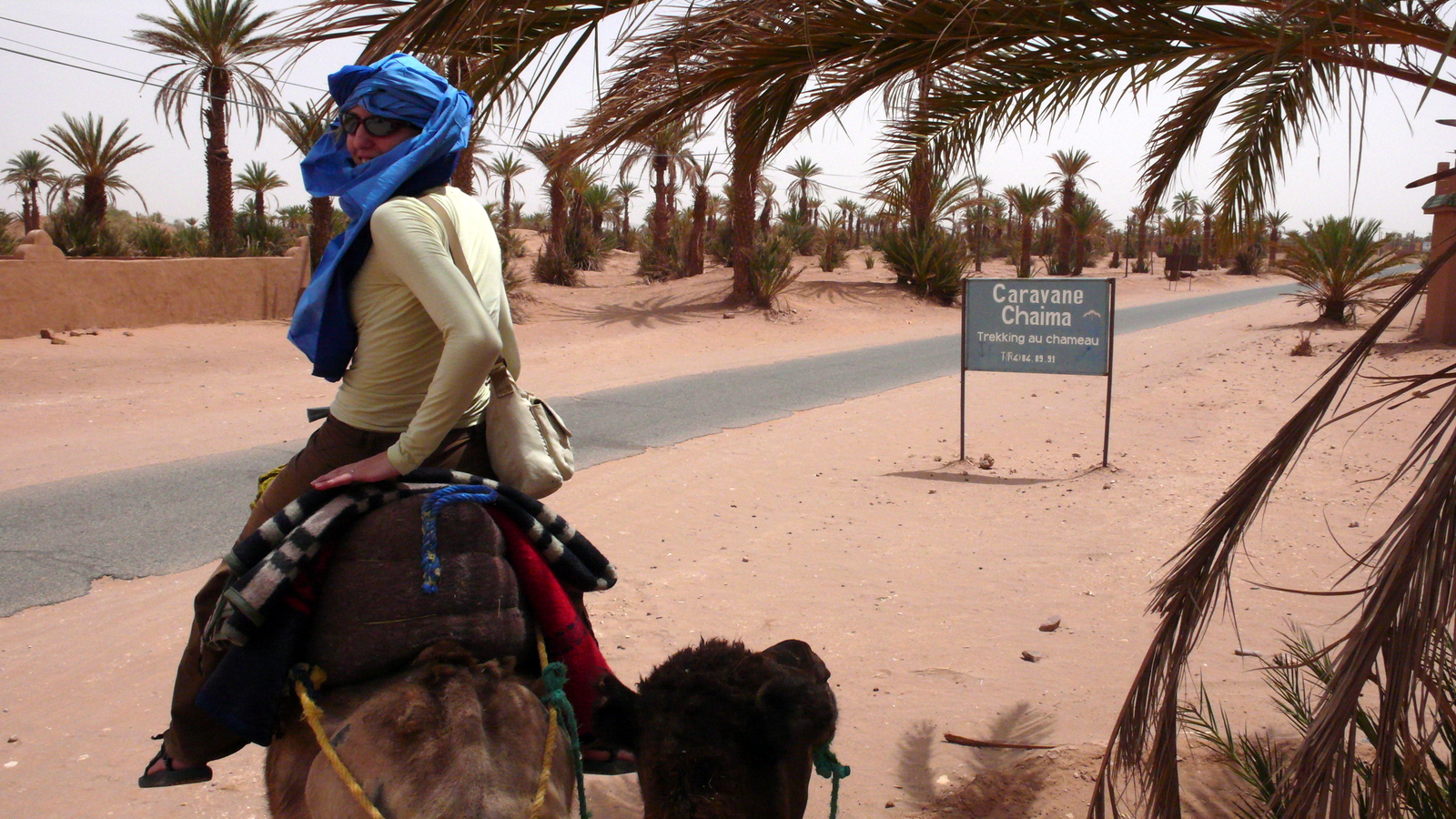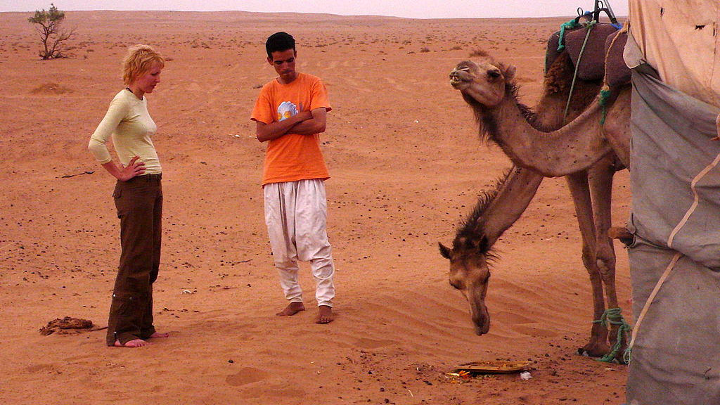 Nasa mala karavana je krenila na pot ob 12h po lokalnem casu. Najin vodic in se en fant, ki je skrabel za kamele sta sla pes, potem smo imeli eno za nosenje tovora, Mary je bla naslednja in jaz zadnji v karavani. Res pa je da so mogl uno ki je nosila tovor ze takoj v zacetku zamenjat saj se je spuntala tista ki je bila prva misljena. kasnej se je spuntala se tista ki je nosila Mary. Jahanje kamele sploh ni prou naporno, lepo pocasi se zibas gor na njenem hrbtu in gres s hitrostjo vodica, ki gre itak pes. Karavana kamel je povezana med seboj s spago in ce se slucajn kasna spaga vmes odveze, kamela sam obstane in potem poklices vodica… kar se je parkrat ponovil. No enkrat se je vodic mal zaustavil, ker je iskal pot cez sipine in una kamela, ki je nosila Mary se je sam usedla in ni hotela vec vstat dokler ni razjahala, potem je blo pa uredu in je lahk hodila. Mary pa pes… kaksno urco vsaj.