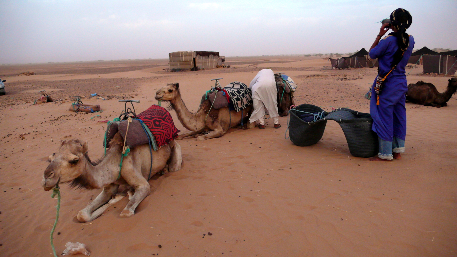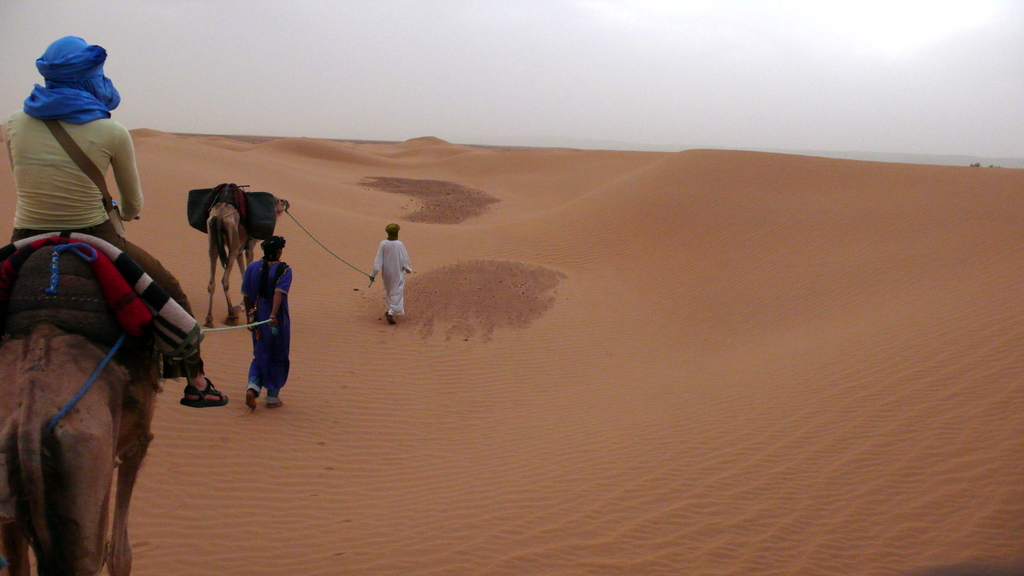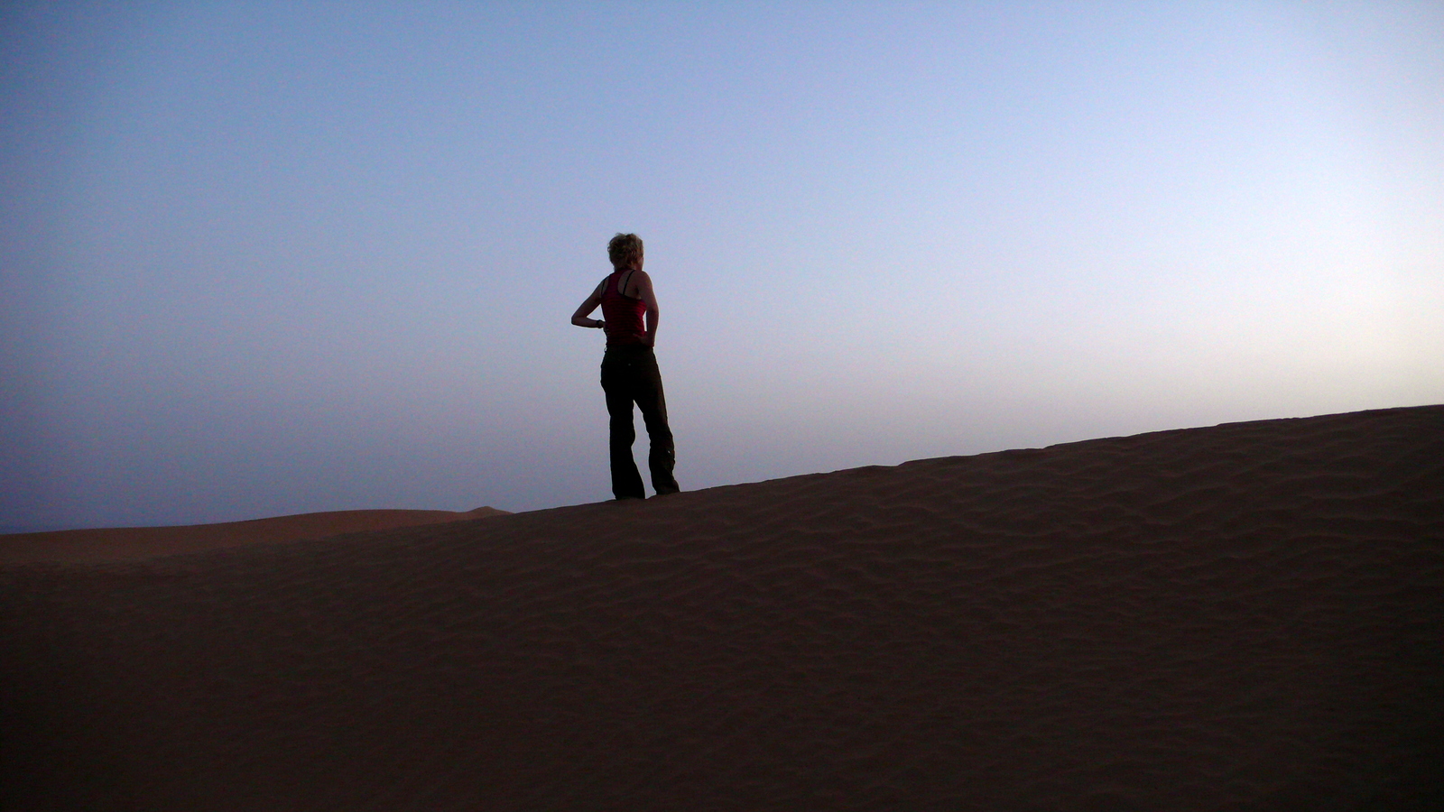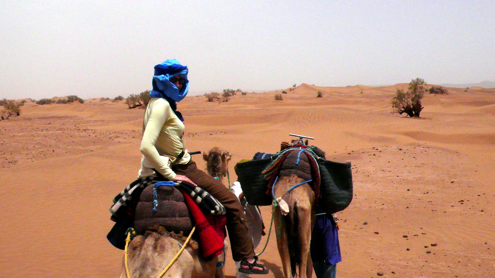 Nasa mala karavana je krenila na pot ob 12h po lokalnem casu. Najin vodic in se en fant, ki je skrabel za kamele sta sla pes, potem smo imeli eno za nosenje tovora, Mary je bla naslednja in jaz zadnji v karavani. Res pa je da so mogl uno ki je nosila tovor ze takoj v zacetku zamenjat saj se je spuntala tista ki je bila prva misljena. kasnej se je spuntala se tista ki je nosila Mary. Jahanje kamele sploh ni prou naporno, lepo pocasi se zibas gor na njenem hrbtu in gres s hitrostjo vodica, ki gre itak pes. Karavana kamel je povezana med seboj s spago in ce se slucajn kasna spaga vmes odveze, kamela sam obstane in potem poklices vodica… kar se je parkrat ponovil. No enkrat se je vodic mal zaustavil, ker je iskal pot cez sipine in una kamela, ki je nosila Mary se je sam usedla in ni hotela vec vstat dokler ni razjahala, potem je blo pa uredu in je lahk hodila. Mary pa pes… kaksno urco vsaj.