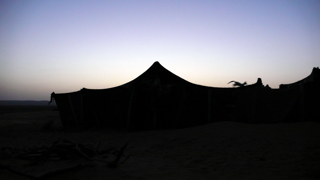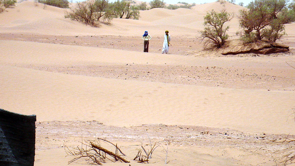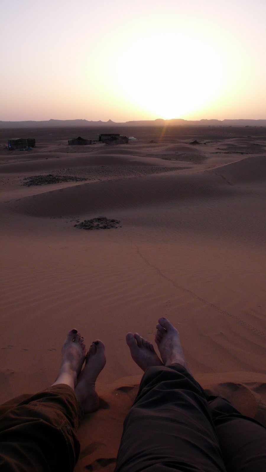 Prvi del poti je vseskup trajal slabe tri ure da smo prisli do baze, ki si jih agencije postavijo da lahko vozijo turiste v puscavo in da jim lahko tam kaj postrezejo. Nekateri fantje tako prezivljajo svoje dneve v teh bazah in skrbijo za gostoljubnost. Sicer pa tud jaz nisem do tja prijahal, ker se je moja kamela spuntala na neki sipini, ki se ji je zdela previsoka in me ni hotela nest cez, tako da sem se tudi ponudil, da ji dam mal frej ter se sprehodim po vrocem pesku. Sredi puscave smo bili nekje okol tretje ure popoldne kar je najbolj vroc del dneva in pesek je tako segret da te na cajte ko moras plezat v breg in ti nogo fajn zasuje se kar na hitro otreses ker renicno pece kot da bi bila zerjavca.