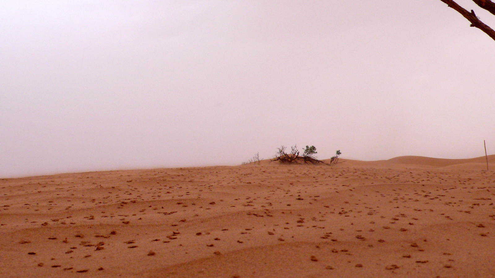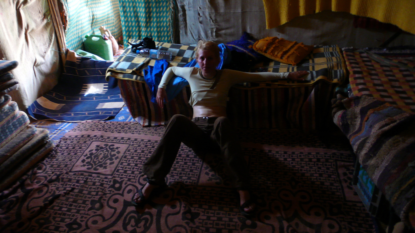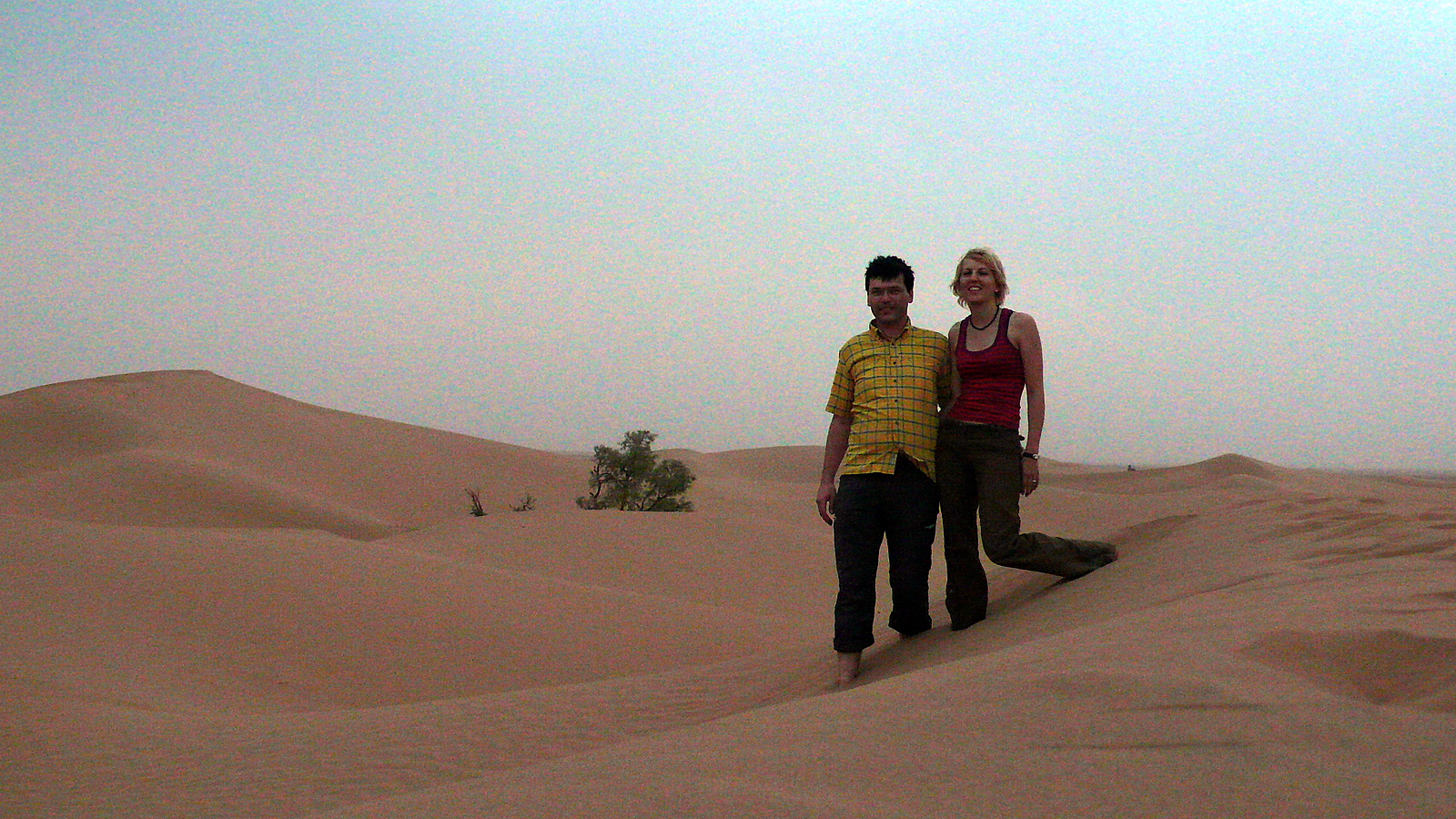Po kosilu je bil na vrsti pocitek, vmes seveda se sladica, ki je tukaj obvezna in najvec krat v obliki sadja. Pot smo nameraval nadaljevat ze prej pa se je kar naenkrat pojavil pesceni vihar. Se sreca da nismo bili na odprtem takrat ker to je pa res grozno. Pesek ti zarije v vse pore. Mi smo pa samo sotor zaprl z vseh strani in poslusali bucanje, ki je bilo obcasno zelo glasno, da se nisi mogu niti pogovarjat. Potem se je malo umirilo, gremo ven in kar naenkrat – dez! Sicer ni prou velik scal sam kaplje so bile pa prava osvezitev.