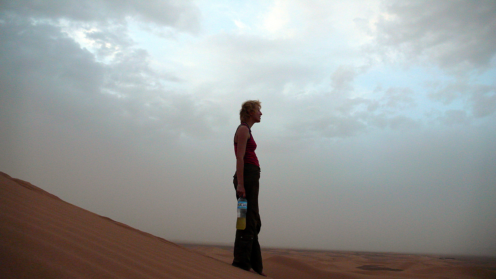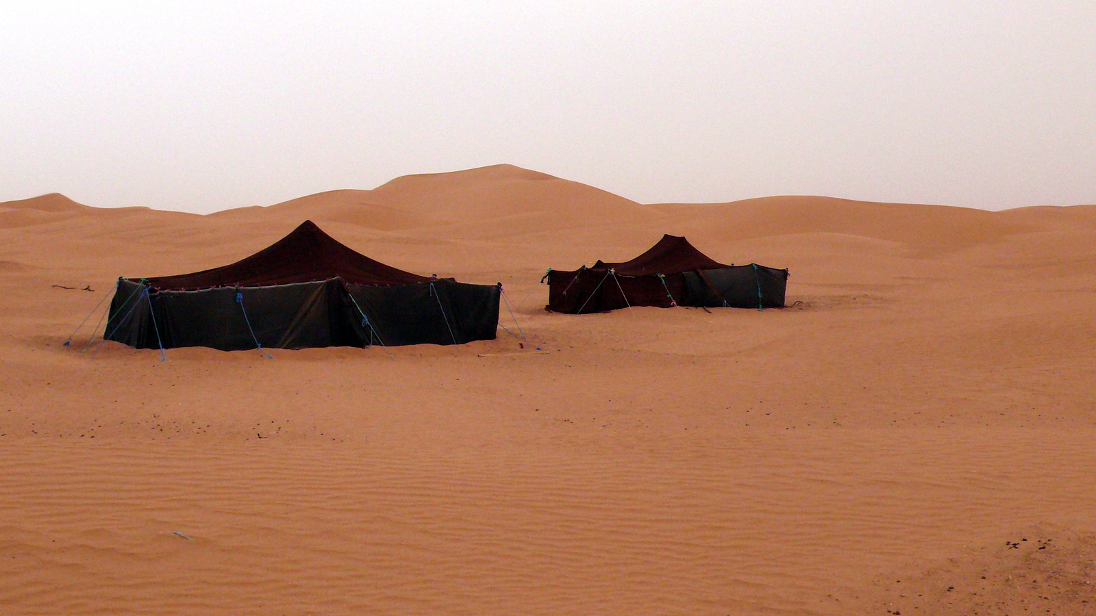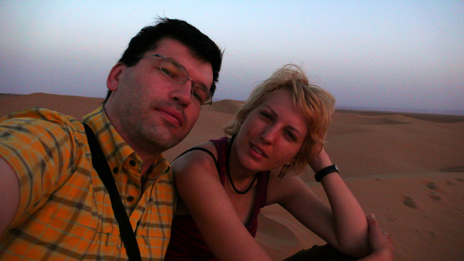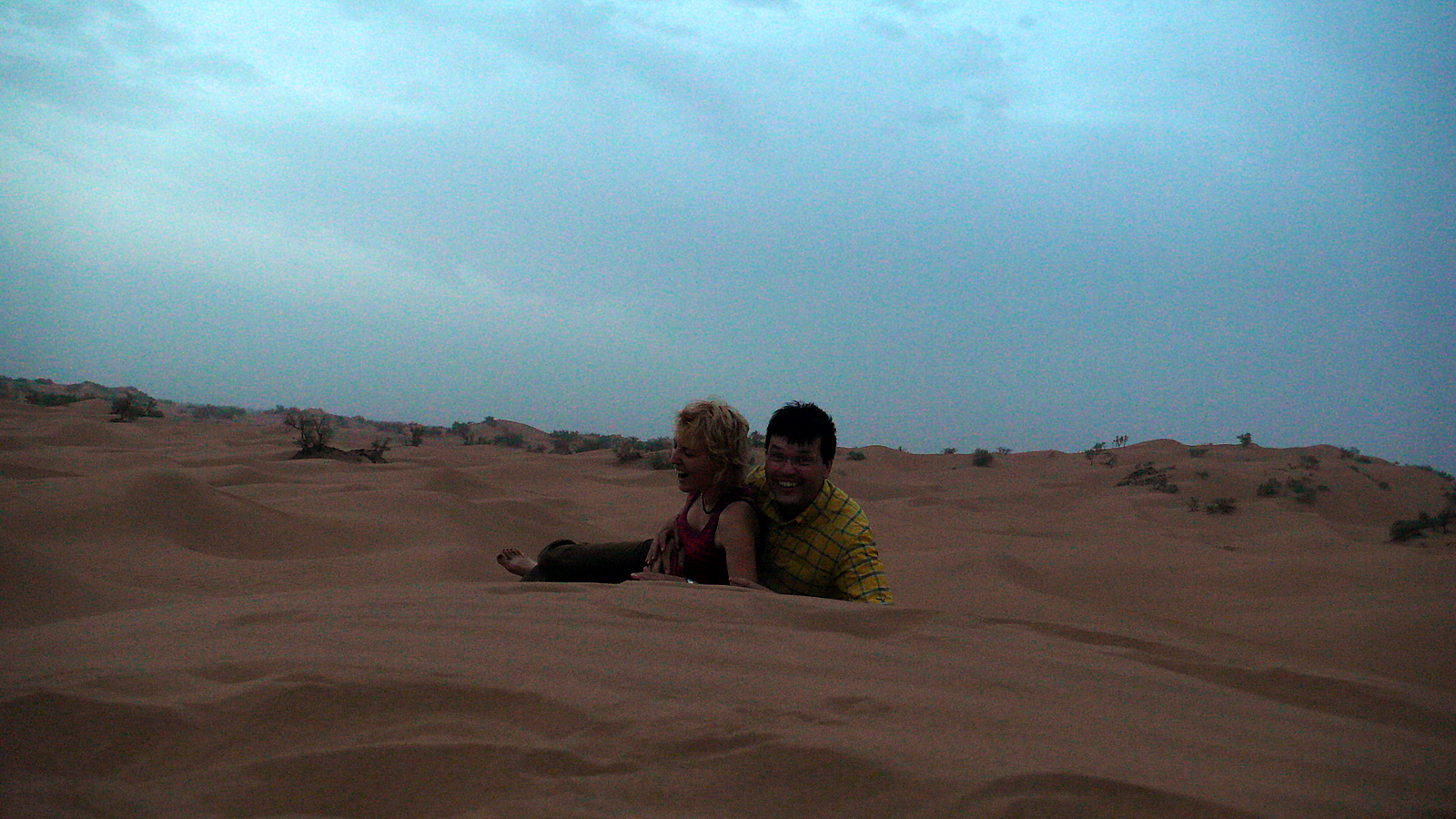 Po kosilu je bil na vrsti pocitek, vmes seveda se sladica, ki je tukaj obvezna in najvec krat v obliki sadja. Pot smo nameraval nadaljevat ze prej pa se je kar naenkrat pojavil pesceni vihar. Se sreca da nismo bili na odprtem takrat ker to je pa res grozno. Pesek ti zarije v vse pore. Mi smo pa samo sotor zaprl z vseh strani in poslusali bucanje, ki je bilo obcasno zelo glasno, da se nisi mogu niti pogovarjat. Potem se je malo umirilo, gremo ven in kar naenkrat – dez! Sicer ni prou velik scal sam kaplje so bile pa prava osvezitev.